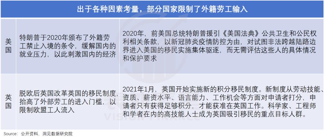 美英两国不欢迎的姿态呼之欲出,前者2020年颁布了外籍劳工禁止入境的条令;后者脱欧后,设立的积分门槛使低薪、低技能的欧盟公民再难以进入英国市场。