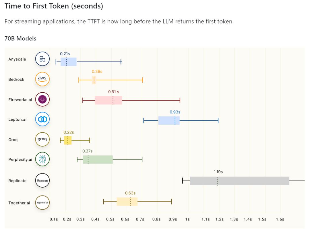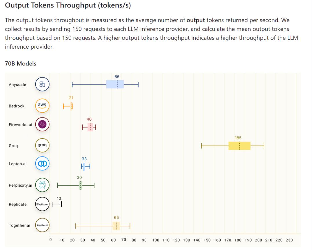 当然,Groq到底有多快,还是要多方比较才能有个完整概念。在github有一个针对70B大模型在不同平台运行速度的测试。可以发现,无论是每秒生成tokens还是响应速度,Groq都是遥遥领先。