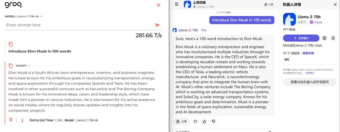 硅基君问了Groq上的Llama-2-70b和POE上的Llama-2-70b,同样一个问题“Introduce Elon Musk in 100 words”。