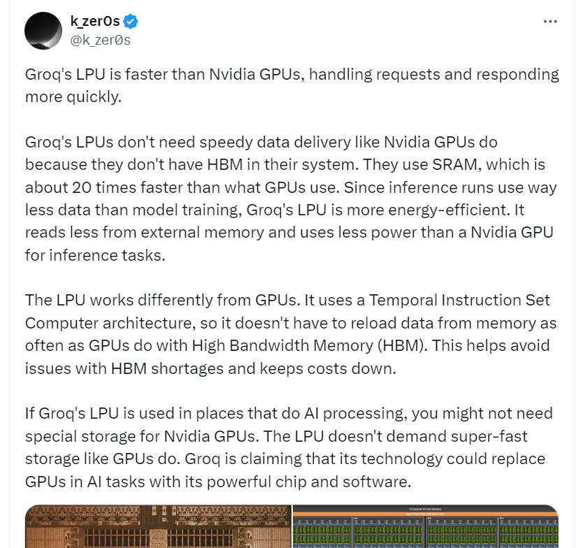根据twitter网友解释,LPU之所以比GPU快,主要原因在于它使用的存储技术和架构设计。