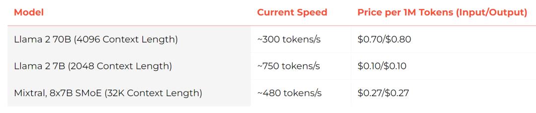 目前Groq支持api接入,一共提供了3个模型,分别是Llama 2 70B、Llama 2 7B 和Mixtral 8x7B SMoE。价格上,Groq也是相当便宜,Llama 2 70B输入和输出价格分别为0.7$/1000k tokens 和 0.8$/1000k tokens。价格方面,Groq保证,一定低于市面上同等价格。