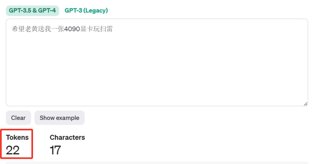 chatgpt是如何切分文本的,可以参考OpenAI的分词器网页。比如“希望老黄送我一张4090显卡玩扫雷”这句话,chatgpt就会把它切分成22个tokens。