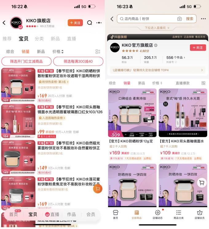 截自淘宝KIKO旗舰店(左);抖音KIKO官方旗舰店(右)