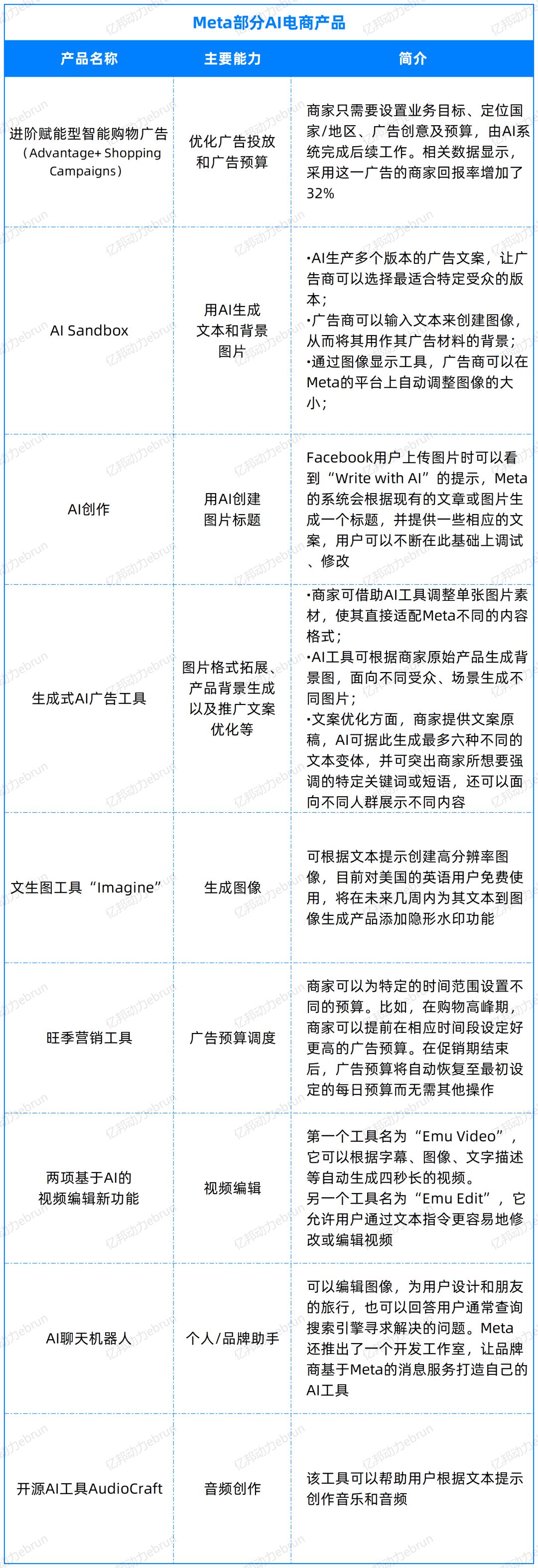 当然,即便是把范围圈定在电商相关业务内,Meta的AI工具也不仅于此,还包括AI广告做图工具、旺季广告预算工具等等。