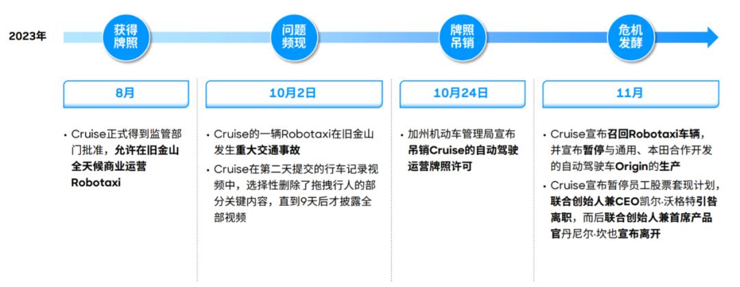 Cruise 2023一整年都可以说是诸事不顺:8月获得旧金山全天候运营牌照;10月2日发生事故;10月24日吊销执照;11月,宣布召回Robotaxi车辆;随后就是一系列的离职和裁员。