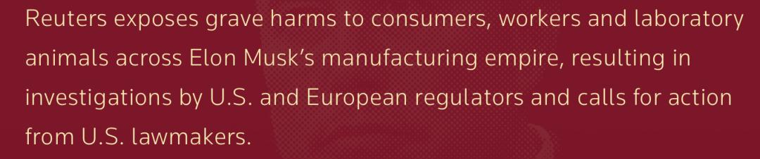 路透揭露了埃隆·马斯克的制造帝国对消费者、工人和实验动物造成了严重伤害,导致美国和欧洲监管机构展开调查,并呼吁美国立法者采取行动。