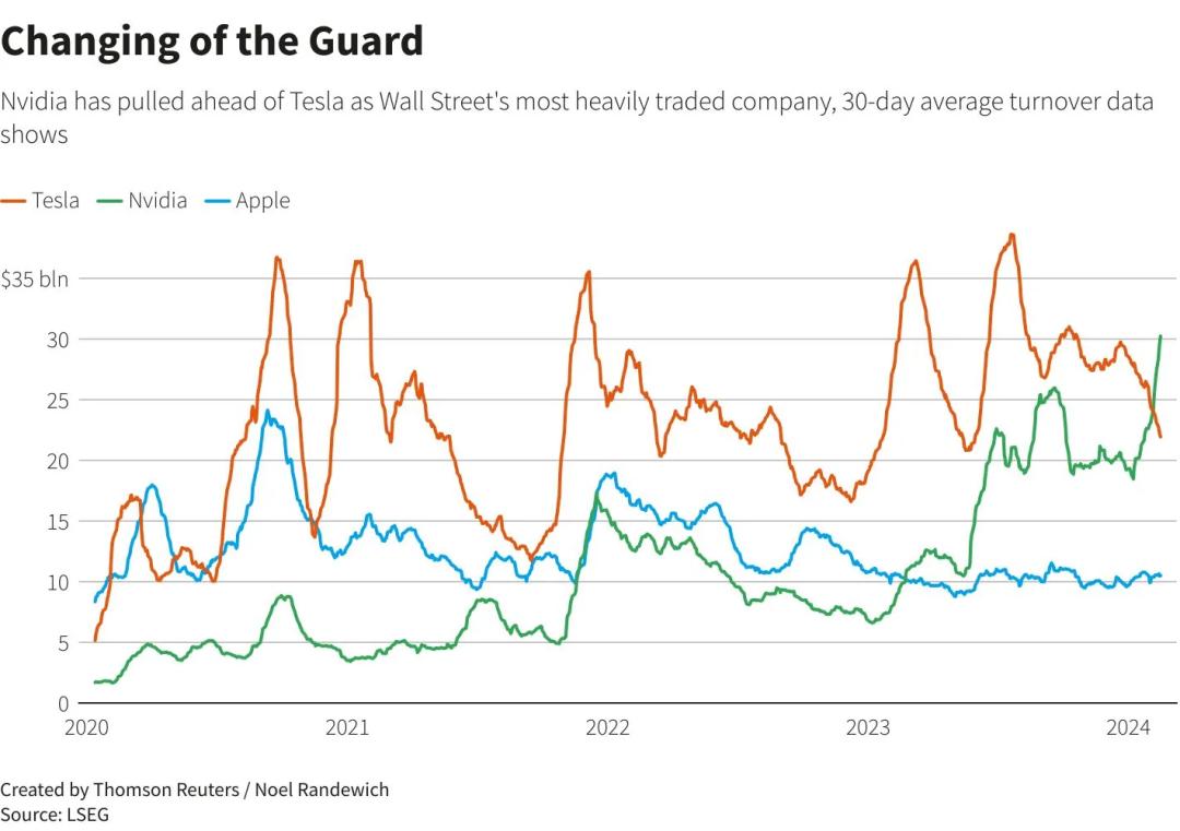 就在昨天,英伟达还因为AI领域的大热,取代了此前常年第一的特斯拉,成为 华尔街交易量最多的股票。