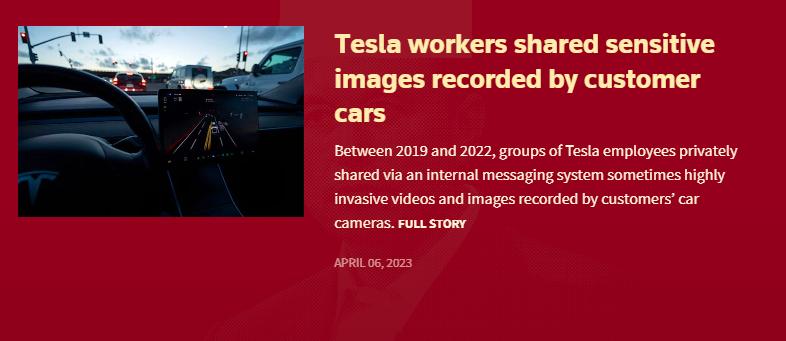 另外,这个团队还曝光了在2019年至2022年间,特斯拉员工通过内部消息传递系统私下分享客户车载摄像头记录的敏感视频和图像, 侵犯司机隐私。