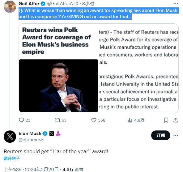 他们靠挖特斯拉黑料,获年度新闻大奖,马斯克:年度骗子