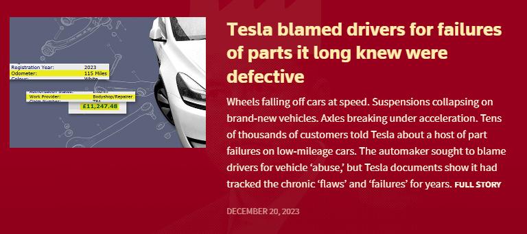 比如揭露特斯拉 隐瞒转向和悬挂部件的危险缺陷,还甩锅车主“滥用汽车”导致的故障问题。