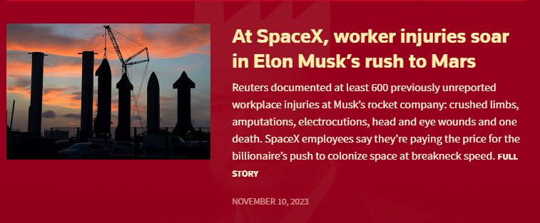 有一篇报道了马斯克旗下火箭制造商SpaceX公司,称 隐瞒工人受伤和死亡的人数不断激增,至少有 600起此前未报道的工伤事故:四肢被压伤、截肢、触电、头部及眼睛受伤,以及1人死亡等。