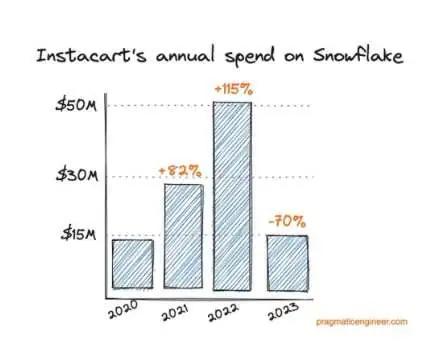 订阅,是最让人羡慕的商业模式。尤其是今年,Instacart 上市的时候披露,他们在 2020 年“向 Snowflake 支付了 1300 万美元”,这个数字在 2021 年迅速增长至 2800 万美元,到 2022 年更是为“基于云的数据仓库服务”支付了 5100 万美元。可时间来到 2023 年,开销数字似乎出现了逆转,Instacart 表示“我们预计全年将向 Snowflake 支付约 1500 万美元。”这是非常可怕的数字,中国应该没有一个公司单年数据仓库能花费超过 5100 万人民币,更不用说订阅制。
