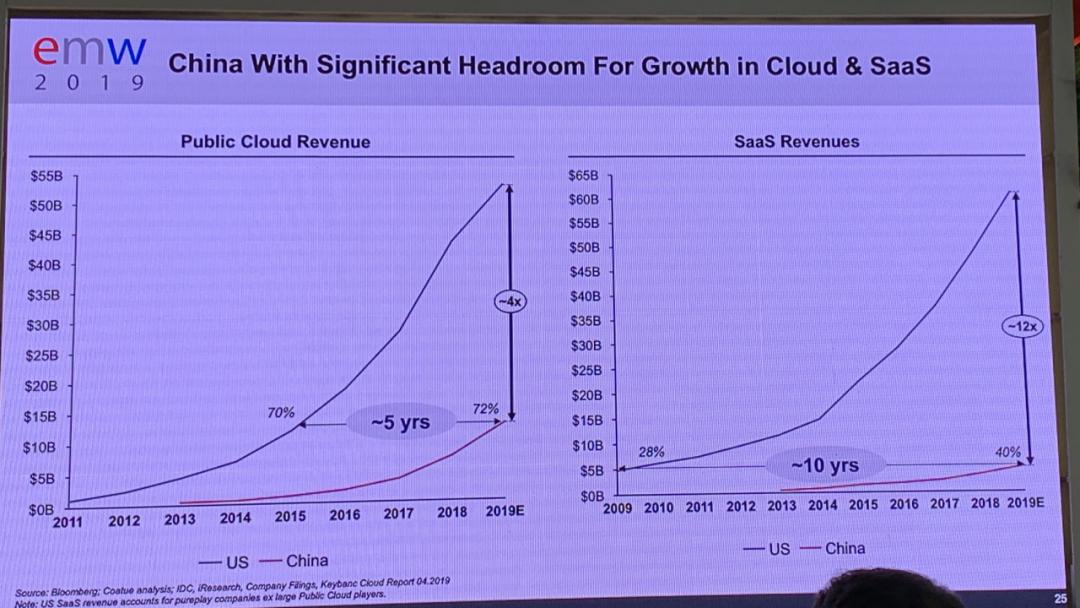 从资本市场的分析,我们也能看到在云计算这个市场中美的巨大差异。普遍来说,中美在云计算市场的差距在7-8年左右。这是市场的事实,我们需要考虑不同市场的差异来设计我们的产品和 GTM 策略。