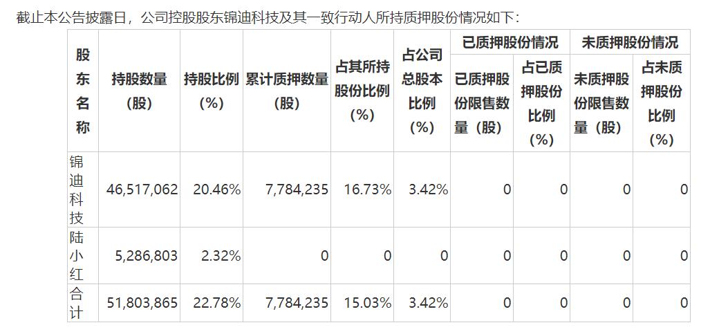截至2023年12月29日,锦迪科技累计质押公司约778万股股份,占其所持股份比例的16.73%。