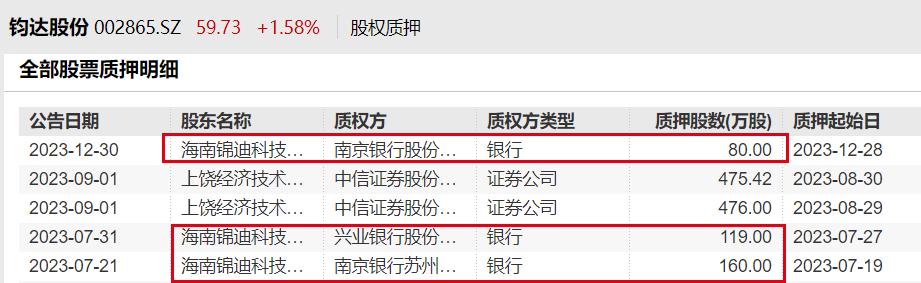 但杨氏家族似乎并不满足于此。在减持、股权转让之外,海南锦迪(钧达股份在A股发布公告亦称其为“锦迪科技”)还在频频质押股份。