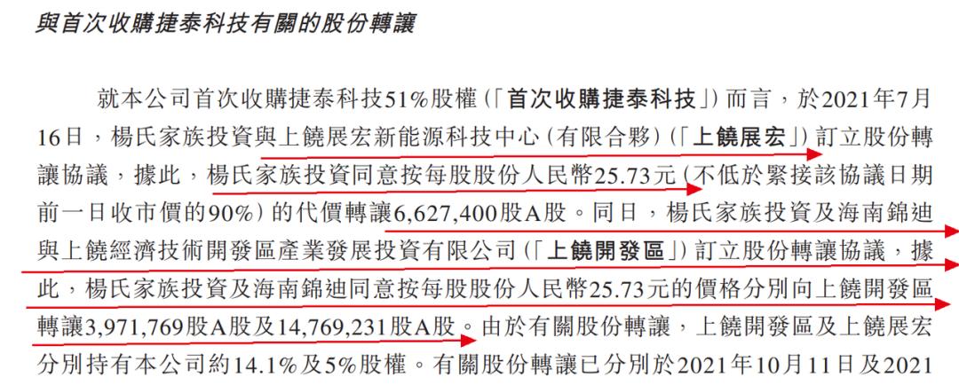 招股书显示,2021年7月,杨氏家族投资同意向上饶展宏以每股25.73元的代价转让662.74万股A股。与此同时,杨氏家族投资及杨氏家族控股的海南锦迪同意按每股25.73元的价格分别向上饶开发区转让397.18万股A股及1476.92万股A股。