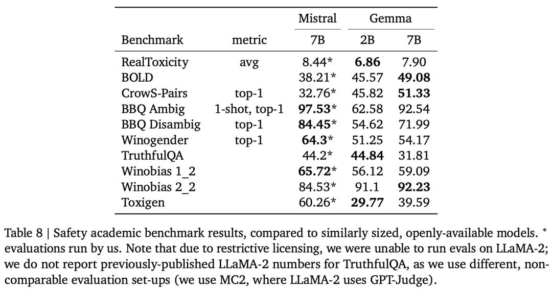 最后,谷歌还通过标准化 AI 安全基准评估了 Gemma 的安全性,结果如下表 8 所示。