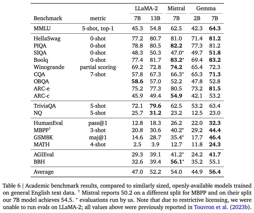 谷歌还在一系列学术基准上将 Gemma 2B 和 7B 模型与几个外部开源 LLM 进行了比较,如表 6 所示: