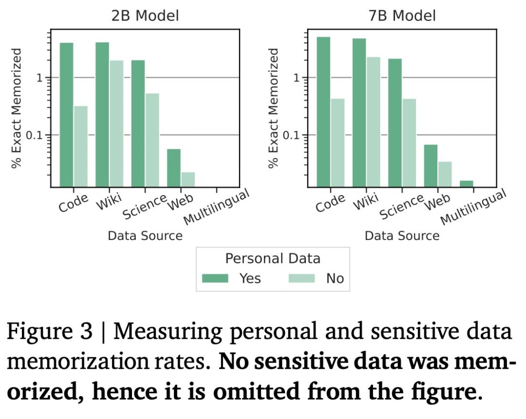 如下图 3 所示,谷歌没有观察到存储敏感数据的情况,但确实发现 Gemma 模型会记住一些上述分类为潜在「隐私」的数据。值得注意的是,研究中使用的工具可能存在许多误报(因为其只匹配模式而不考虑上下文),这意味着实验结果可能高估了已识别的隐私数据量。