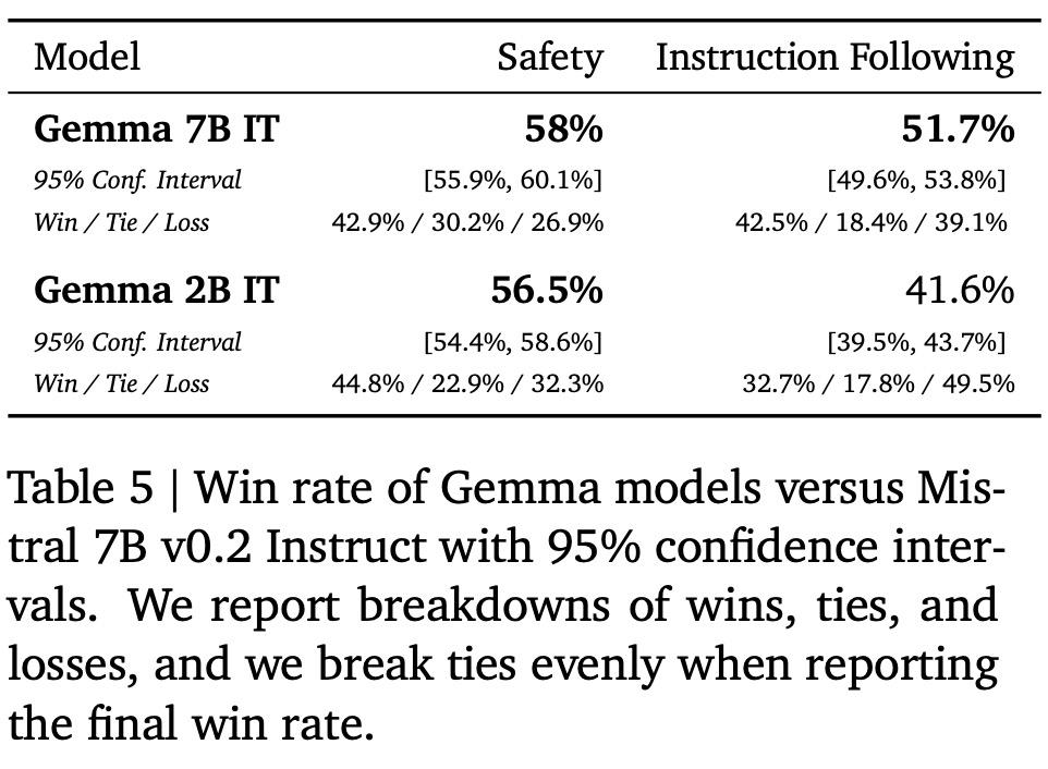 与 Mistral v0.2 7B Instruct 相比,Gemma 7B IT 的正胜率为 51.7%,Gemma 2B IT 的胜率为 41.6%。在测试基本安全协议的约 400 条 prompt 中,Gemma 7B IT 的胜率为 58%,而 Gemma 2B IT 的胜率为 56.5%。表 5 中报告了相应的数字。