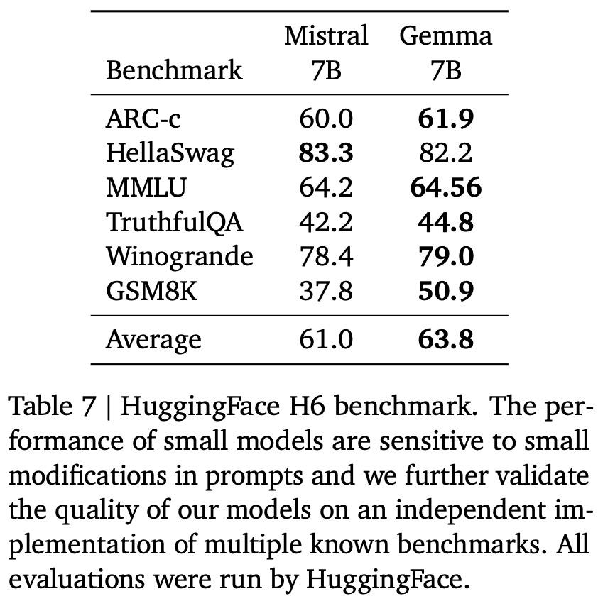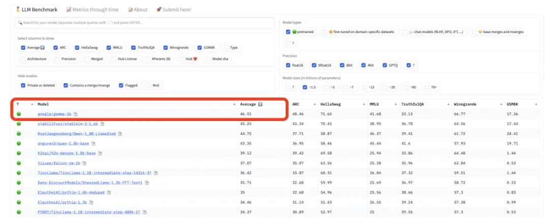 在 HuggingFace 的 LLM leaderboard 上,Gemma 的 2B 和 7B 模型已经双双登顶。