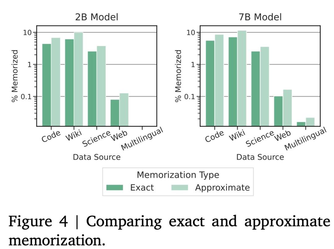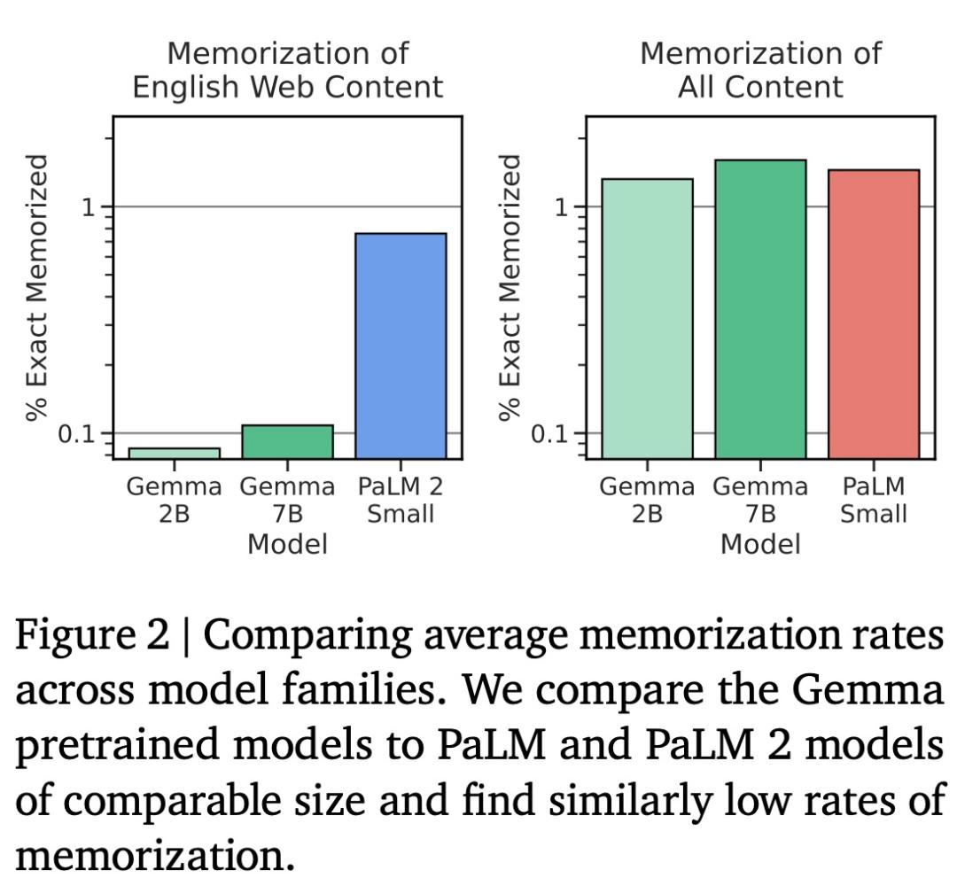 谷歌使用 Anil 等人采用的方法测试 Gemma 的记忆能力,具体而言,他们从每个语料库中采样 10000 个文档,并使用前 50 个 token 作为模型的 prompt。在此过程中,谷歌主要关注精准记忆,如果模型生成的后续 50 个 token 与文本中的真实后续文本完全匹配,则将该文本分类为已记忆。图 2 将评估结果与同等规模的 PaLM 和 PaLM 2 模型进行了比较,结果如下所示。