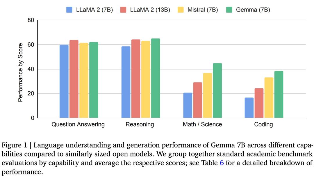 下图 1 为 Gemma(7B)与 LLaMA 2(7B)、LLaMA 2(13B)和 Mistral(7B)在问答、推理、数学和科学、编码等任务上的性能比较。可以看到,Gemma(7B)表现出了优势(除了在问答任务上弱于 LLaMA 2(13B))。