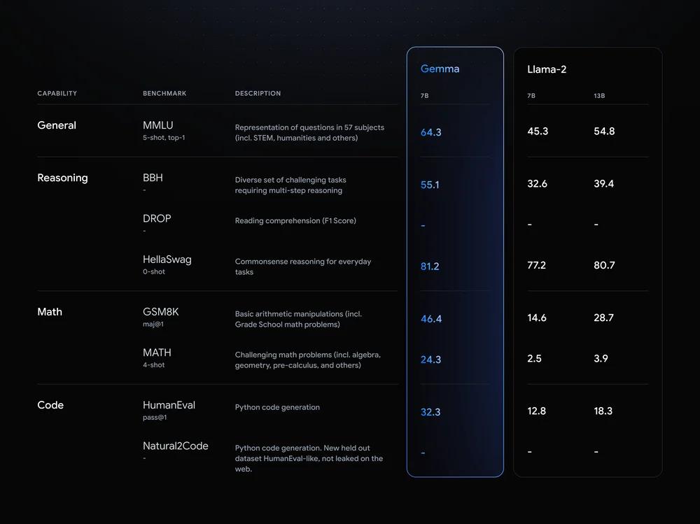尽管体量较小,但谷歌表示 Gemma 模型已经「在关键基准测试中明显超越了更大的模型」,对比的包括 Llama-2 7B 和 13B,以及风头正劲的 Mistral 7B。