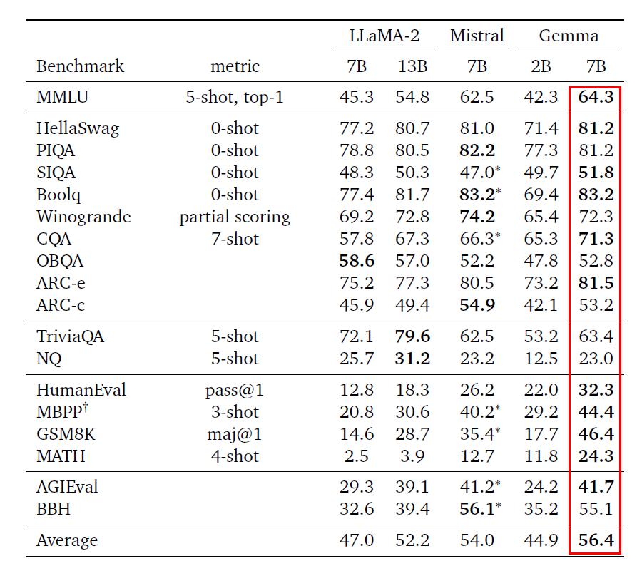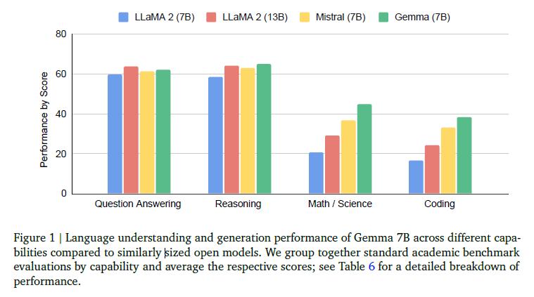 从具体能力上看,Gemma 7B在问答、推理、数学/科学、代码等方面的标准学术基准测试平均分数都高于同规模的Llama 2和Mistral模型。