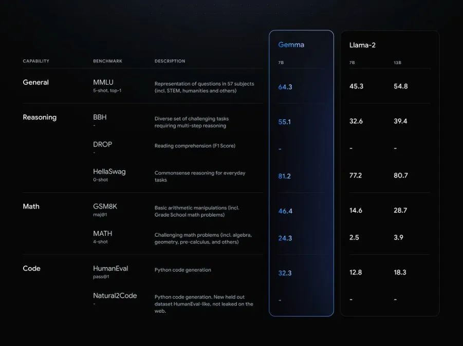 性能方面,谷歌称Gemma在MMLU、BBH、HumanEval等八项基准测试集上大幅超过Llama 2。