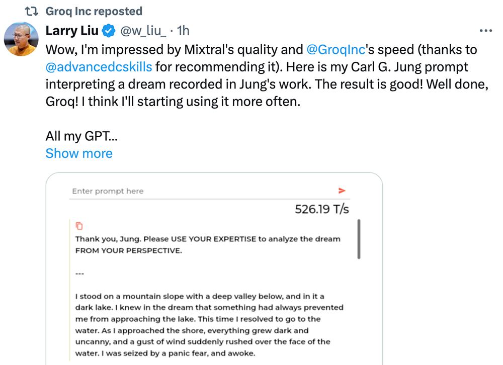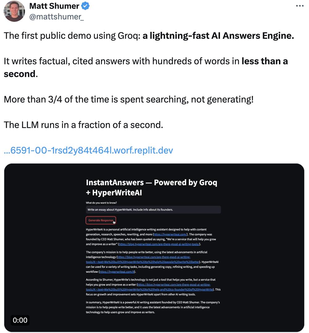 AI写作助手创企HyperWriteAI的CEO Matt Shumer评价LPU“快如闪电”,“不到1秒写出数百个单词”,“超过3/4的时间花在搜索上,而非生成”,“大语言模型的运行时间只有几分之一秒”。