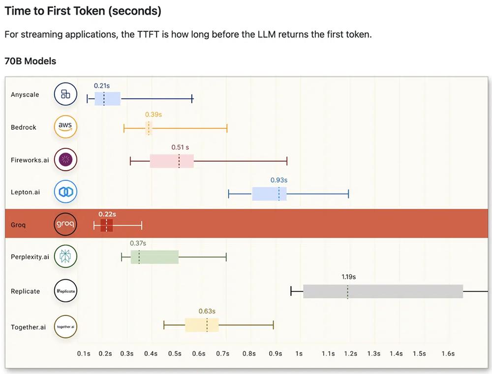 对于Time to First Token,其缩短到0.22秒。由于LPU的确定性设计,响应时间是一致的,从而使其API提供最小的可变性范围。这意味着更多的可重复性和更少的围绕潜在延迟问题或缓慢响应的设计工作。