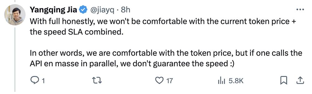贾扬清还在评论区谈道:“老实说,我们对当前的token价格+速度SLA组合感到不适。换句话说,我们对token价格感到满意,但如果并行调用API,我们无法保证速度。”