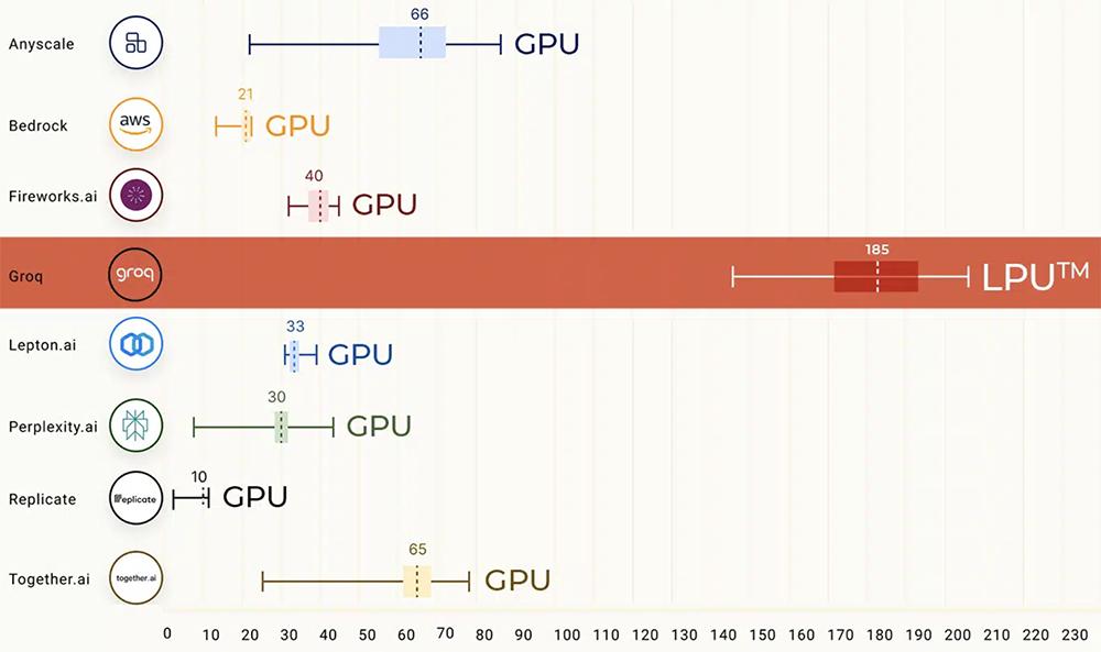 在公开的大语言模型基准测试上,LPU取得了压倒性战绩,运行Meta AI大语言模型Llama 2 70B时,输出tokens吞吐量比所有其他基于云的推理供应商最高要快18倍。