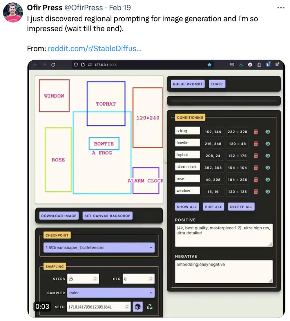 有网友分享了图像生成的区域提示,并评价“非常印象深刻”。