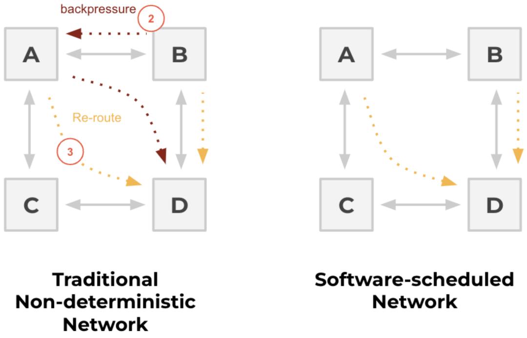 受软件优先思想的启发,Groq将执行控制和数据流控制的决策步骤从硬件转移到了编译器,以调度跨网络的数据移动。所有执行计划都在软件栈中进行,不再需要硬件调度器来弄清楚如何将东西搬到芯片上。这释放了宝贵的芯片空间,并提供了额外的内存带宽和晶体管来提高性能。