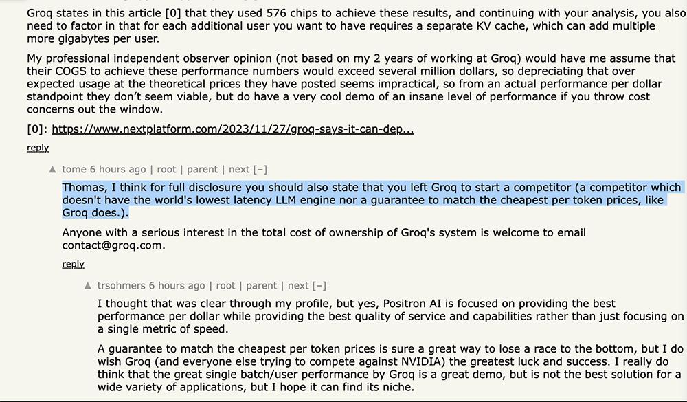 现在,Groq继续保持着高调,除了官号积极出面互动外,前员工和现员工还在论坛上“撕”起来了。前员工质疑实际成本问题,现员工则抨击这位前员工离开并创办了一家Groq的竞争对手+没做出“世界最低延迟的大语言模型引擎”+没保证“匹配最便宜的token价格”。