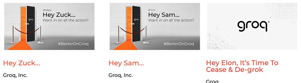 随后“官网喊话”就成了Groq的特色,尤其是近期,Groq接连发文“喊话”马斯克、萨姆·阿尔特曼、扎克伯格等AI大佬。特别是在《嘿 萨姆…》文章中,公然“嫌弃”OpenAI的机器人太慢了,并给自家LPU打广告,声称运行大语言模型和其他生成式AI模型的速度是其他AI推理解决方案速度的10倍。