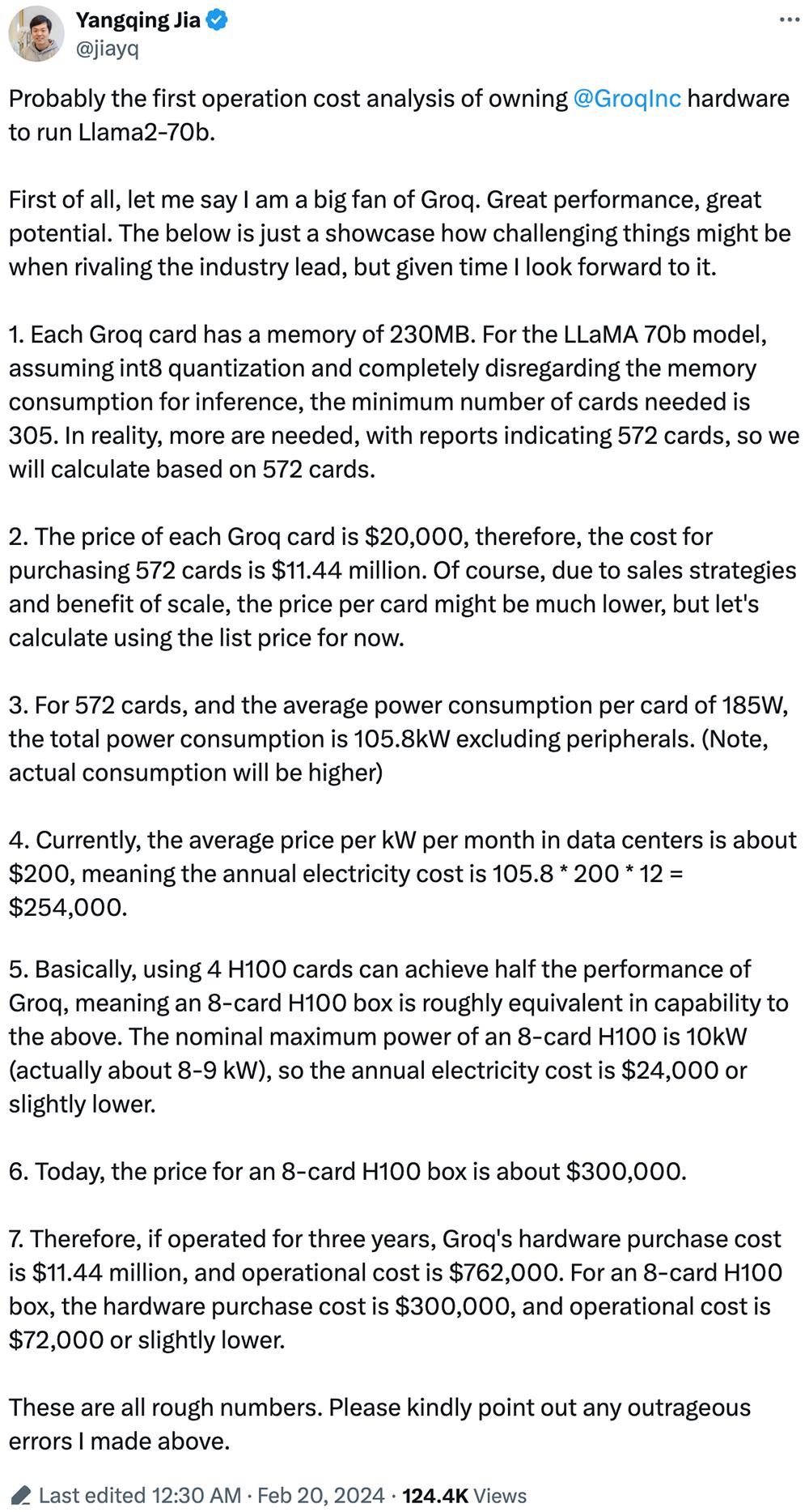 5. 基本上,采用4张H100卡可实现Groq的一半性能,也就是说,一台8卡H100与上面的性能相当。8卡H100的标称最大功率为10kW(实际大概在8-9kW),因此每年电费为2.4万美元或更低一些。