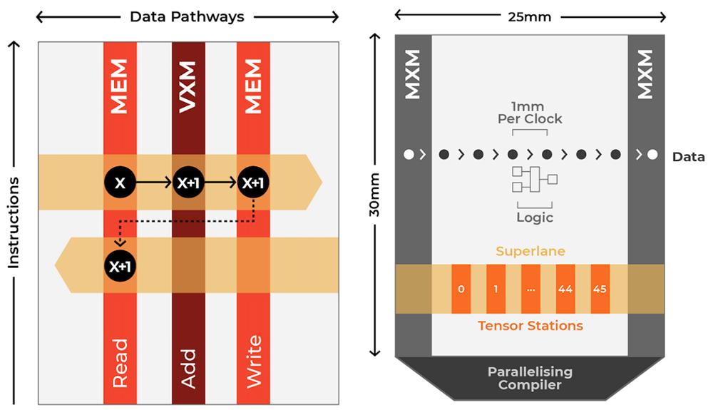 由于控制流程已进入软件栈,硬件是一致且可预测的,开发人员可以精确获知内存使用情况、模型效率和延迟。这种确定性设计使用户可在将多芯片扩展连接时,精确把控运行一次计算需要多长时间,更加专注于算法并更快地部署解决方案,从而简化了生产流程。