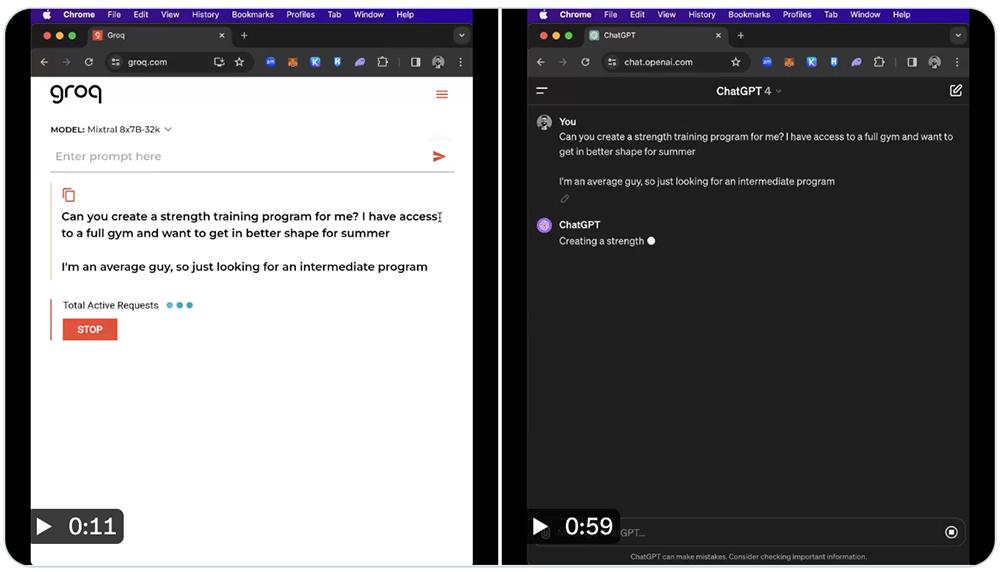 ▲输入相同指令,ChatGPT 4生成回答的时间大约1分钟,而在Groq上运行的Mixtral 8x7B-32k只用时11秒。