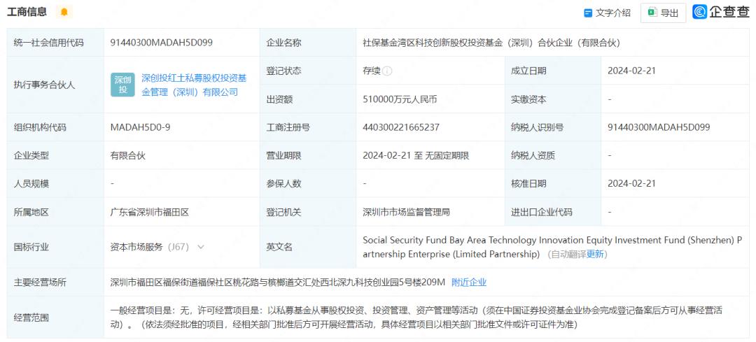 投资界从企查查获悉,2月21日,社保基金湾区科技创新股权投资基金(深圳)合伙企业(有限合伙),也就是此前屡屡提及的“粤港澳大湾区科技创新专项基金”正式注册成立。