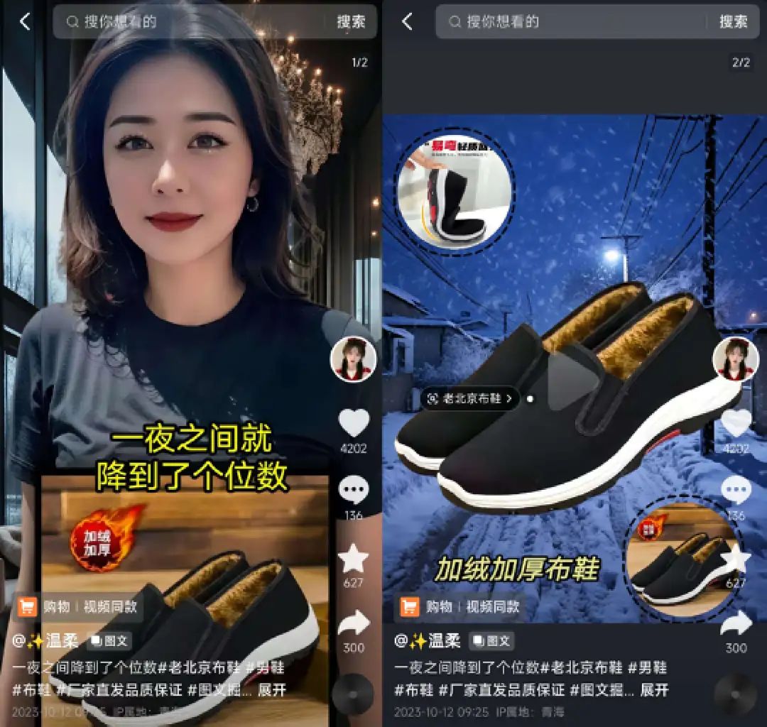 此前,“温柔”曾发布一条老北京布鞋的种草视频,内容是AI美女封面+产品详情图,最终却获赞4202。
