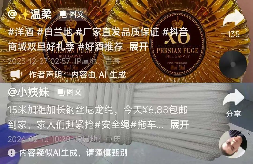 事实上,AI种草博主的不少视频下方都主动或被动地标注了内容由AI生成,但这并不妨碍他们继续卖货。