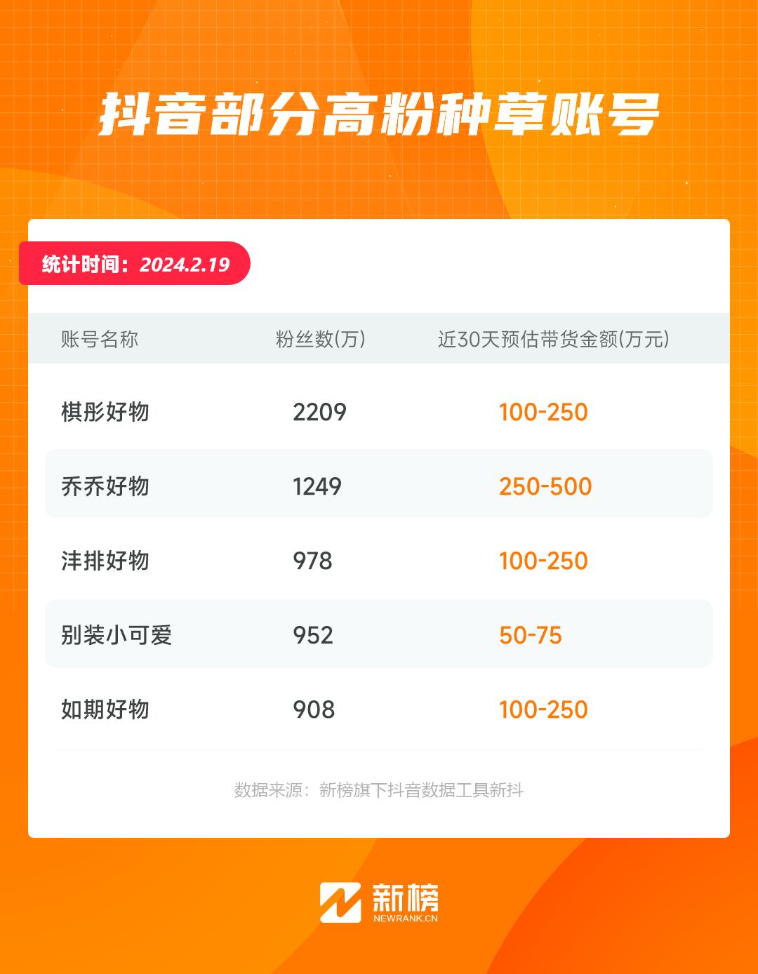 高频发布的种草视频则弥补了单个视频流量不足的困境。据新抖数据统计,“温柔”“小姨妹”“诗诗百货”等账号的月发布作品数均在200条左右。