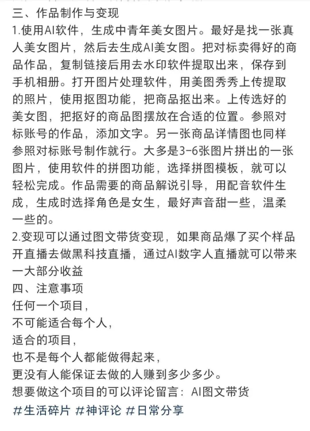 第三,账号违规风险。AI种草博主大多选择售卖低价百货,这是由账号特性决定的。但在低价百货领域,相比低利润的品牌货,只有三无产品、白牌产品才有足够的利润。如果AI种草博主选品不严,极有可能触犯相关法律法规。