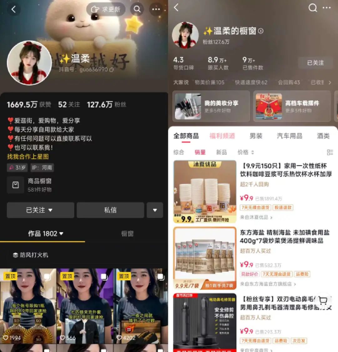 据观察,“温柔”等AI种草博主的账号上架的大多是低价百货,百货类商品有着最广泛的潜在消费客群,九块九包邮的低价极大降低了用户的消费决策成本。