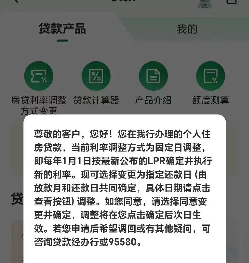 网友发出的邮储银行说明显示,2024年2月1日零时起,该行对符合年初重定价的客户,在登录手机银行贷款页面时向客户弹窗提示进行“利率调整方式变更”。客户可将利率调整方式由固定日调整变更为指定还款日调整,即贷款利率随LPR调整的时间由每年1月1日调整为指定还款日。