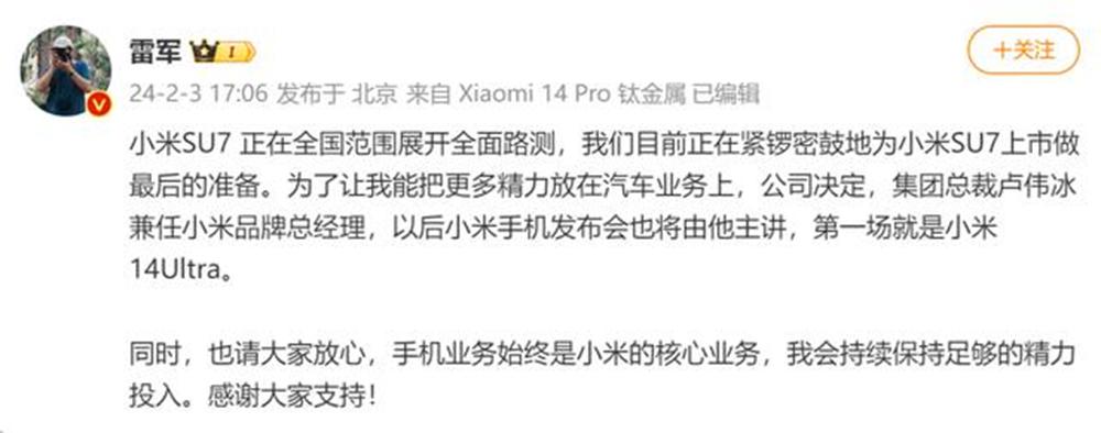 2月3日晚间,雷军在社交媒体发文称,“小米SU7正在全国范围展开全面路测,我们目前正在紧锣密鼓地为小米SU7上市做最后的准备。为了让我能把更多精力放在汽车业务上,公司决定,集团总裁卢伟冰兼任小米品牌总经理,以后小米手机发布会也将由他主讲,第一场就是小米14Ultra。