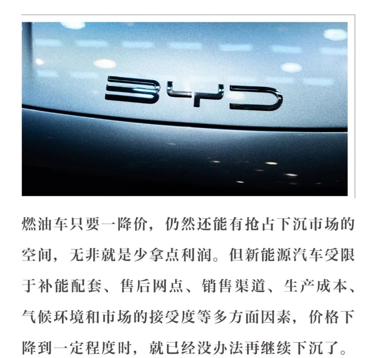 当然,新能源的下沉,还是存在着一定的压力位。燃油车降价仍然还有抢占下沉市场的空间,无非就是少拿点利润。但新能源汽车受限于补能配套、售后网点、销售渠道、生产成本、气候环境和市场的接受度等多方面因素,价格下降到一定程度时,就已经没办法再继续往下沉了。